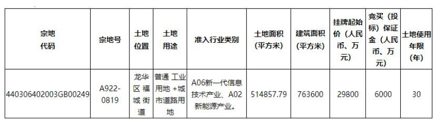 10月19日,據(jù)深圳公共資源交易中心網(wǎng)站顯示,華為以底價2.98億拿下位于龍華區(qū)的一塊普通工業(yè)用地,土地面積514857.79平方米,建筑面積763600平方米。相關信息顯示,該地塊用途為普通工業(yè)用地+城市道路用地,準入行業(yè)類別為A02新能源產(chǎn)業(yè)、A06新一代信息技術產(chǎn)業(yè)。