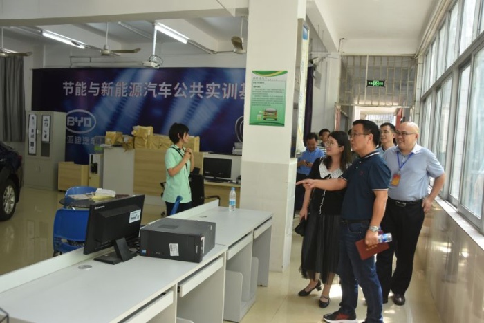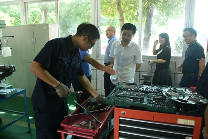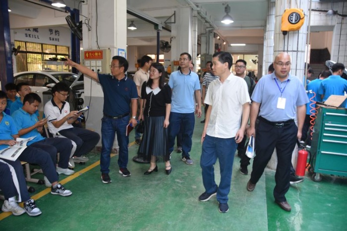 考察團(tuán)首先走進(jìn)學(xué)校汽車技術(shù)部的實(shí)訓(xùn)場室,觀摩師生上課實(shí)操,與師生交流有關(guān)于專業(yè)教學(xué)的設(shè)施設(shè)備、課程內(nèi)容、考核標(biāo)準(zhǔn)等具體內(nèi)容;參觀學(xué)校與企業(yè)合作的汽車維修中心,詢問校企合作的運(yùn)行機(jī)制、運(yùn)作流程。考察團(tuán)還走進(jìn)節(jié)能與興能源汽車公共實(shí)訓(xùn)基地,了解基地內(nèi)環(huán)境、人員和設(shè)備等情況,感受正在建設(shè)廣東省雙高專業(yè)的新能源汽車維修專業(yè)群的新進(jìn)展。