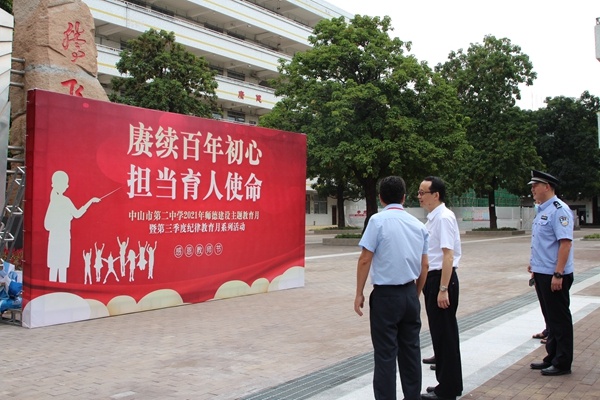 活動(dòng)一:市領(lǐng)導(dǎo)蒞臨中山二中開展教師節(jié)慰問活動(dòng)。9月10日上午,中山市副市長魯罡一行蒞臨中山二中開展教師節(jié)慰問活動(dòng)。魯罡副市長走訪校園,視察校園基建工程,聽取中山二中黨委書記、校長吳祥明同志對(duì)學(xué)校歷史沿革、校史校情、二中近年發(fā)展情況的講解和匯報(bào)。黃圃鎮(zhèn)黨委書記梁泳輝,黃圃鎮(zhèn)黨委委員、市公安黃圃分局局長沈淼陪同慰問。