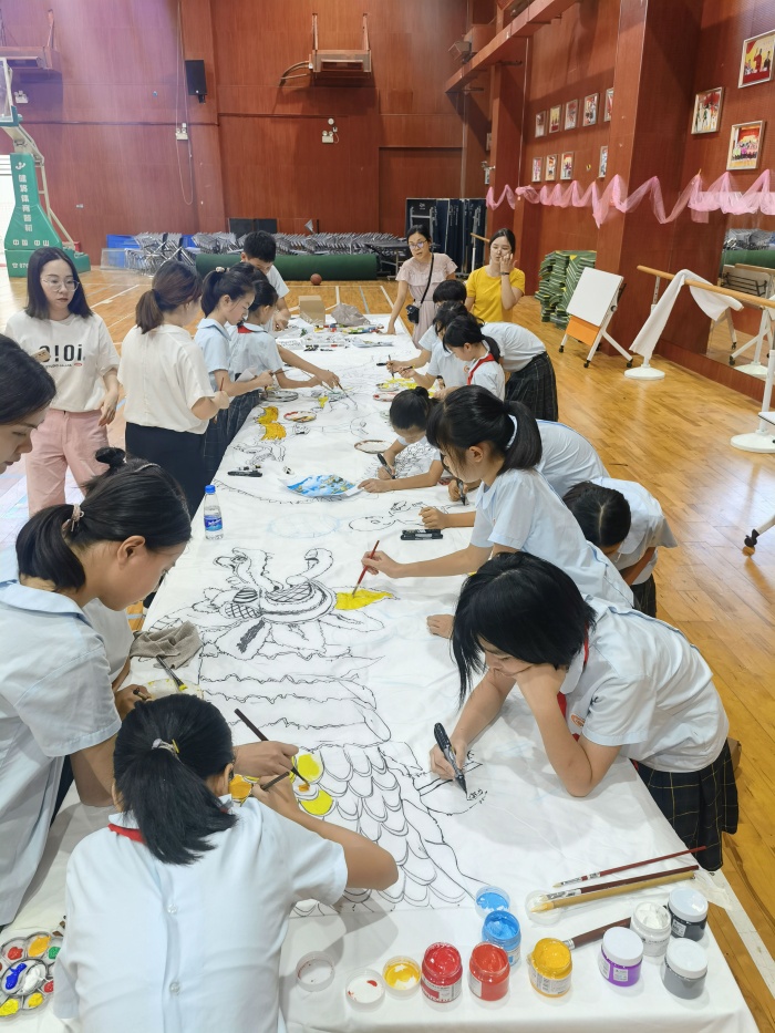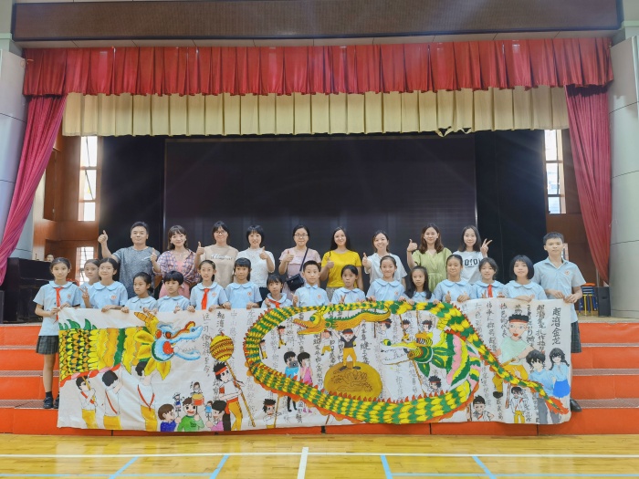 為了弘揚(yáng)優(yōu)秀傳統(tǒng)文化,培養(yǎng)學(xué)生民族精神和愛(ài)國(guó)主義精神,讓非遺文化進(jìn)入校園。學(xué)校創(chuàng)作主題選取中山市非物質(zhì)文化遺產(chǎn)“起灣金龍”為主題,活動(dòng)前,教師通過(guò)給學(xué)生講解起灣金龍的來(lái)歷,讓孩子們對(duì)起灣金龍有進(jìn)一步的了解。隨后,20余名學(xué)生一起在畫(huà)卷上盡情繪畫(huà)。