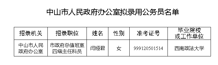 根據(jù)《中華人民共和國(guó)公務(wù)員法》《公務(wù)員錄用規(guī)定》《廣東省公務(wù)員錄用辦法》等有關(guān)規(guī)定,按照《廣東省2021年考試錄用公務(wù)員工作實(shí)施方案》要求,經(jīng)筆試、面試、體檢和考察等程序,擬錄用閆婭君同志為我辦公務(wù)員(情況附后)。